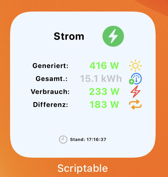 I used your code and changed it a litte bit to show my power consumption and generating. The icons and text color changes depending on the values. I like it.