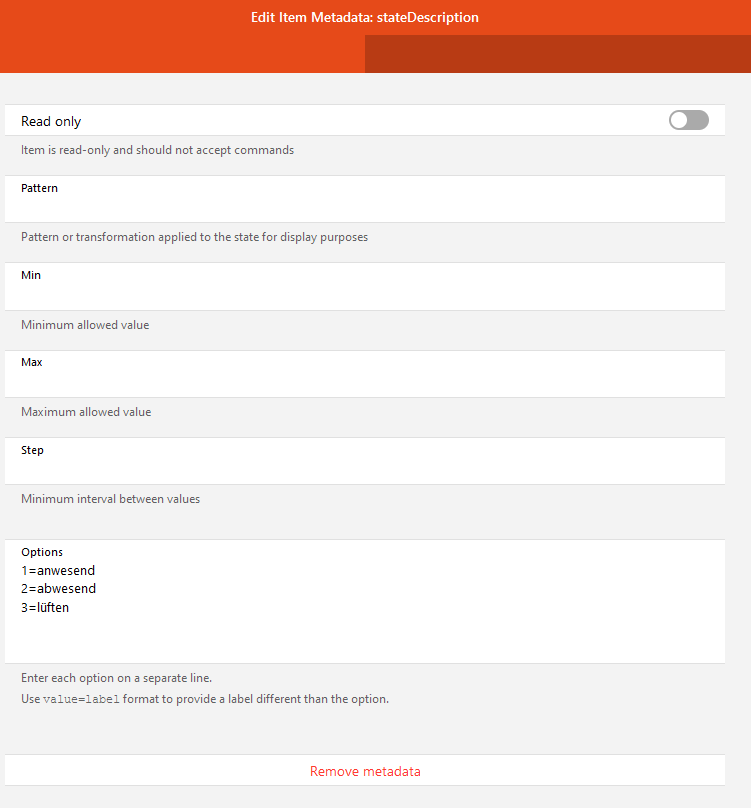 Switch item=Vito_Betriebsmodus label=“Zustand [%s]” mappings=[0=“Aus”, 1=“WW”, 2=“WW+Heizen”, 66=“Party-sofort Heizen”]
