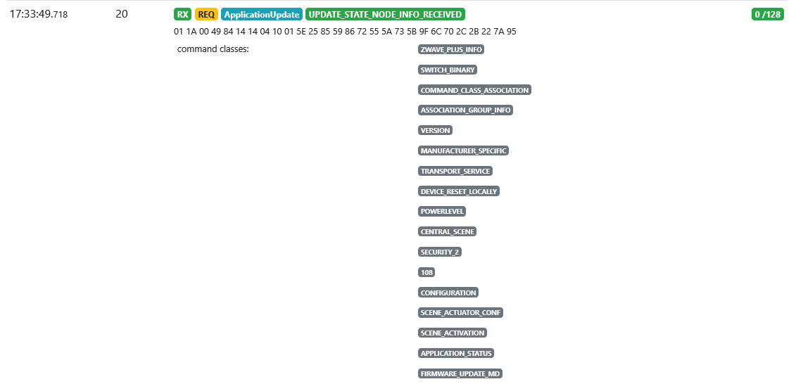 In this case the device is sending a non-sensical message and I don’t see why. Using the Zwave log viewer it is sending all the supported command classes, not a simple basic command.