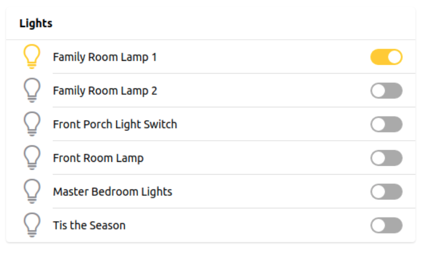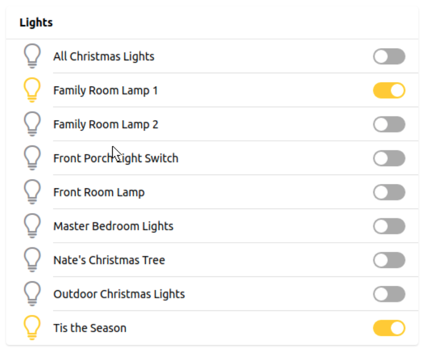 This is a widget that shows all my light switches in a list. The tricky part about it is it will only show the Christmas light Items if “Tis the Season” is turned on. This makes the widget smart enough to adjust during the season where I have more lights to control. ![]()