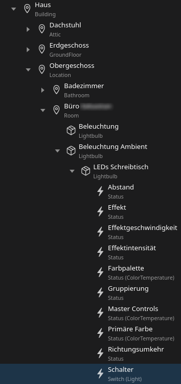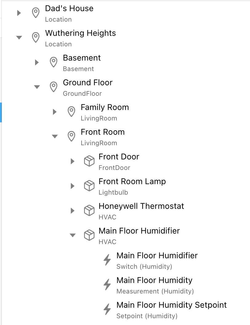In the “Ground Floor” I’ve a number of rooms with stuff automated in them and each gets it’s own location Group Item using the appropriate location tag. The humidifier is in the “Front Room”.