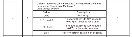 It’s a 1 byte value, with a range from 1 to 254, and 2 options - 0 = “Instantly”, and 255=“1 Second”. You also need to tick the box that says something like “Allow free entry” - this means that the user isn’t limited to only selecting the 2 options, but can also enter any value between 1 and 254.
