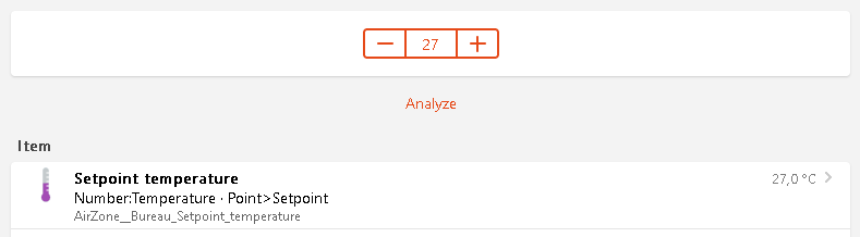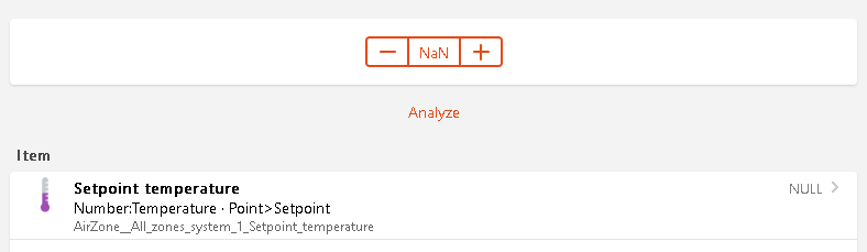 When I go to a setpoint item, the setpoint value is either correct or NaN. When I click + or -, nothing happens on the UI nor on the Airzone System. The value doesn’t change. Sometimes the UI complains : connection error. I see nothing in the logs.