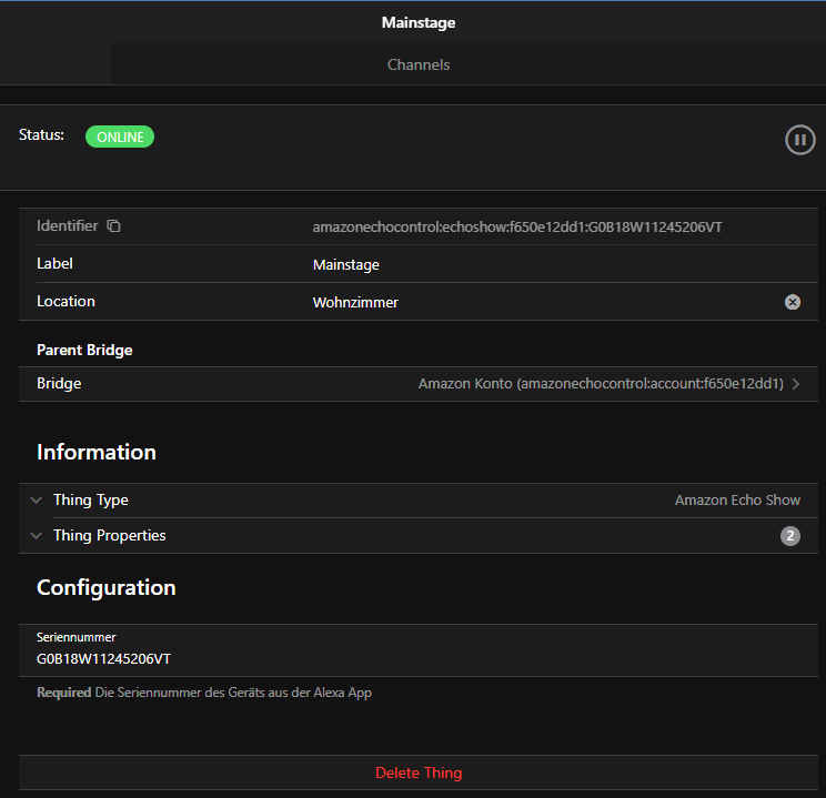 - The settings of the Alexa Thing: