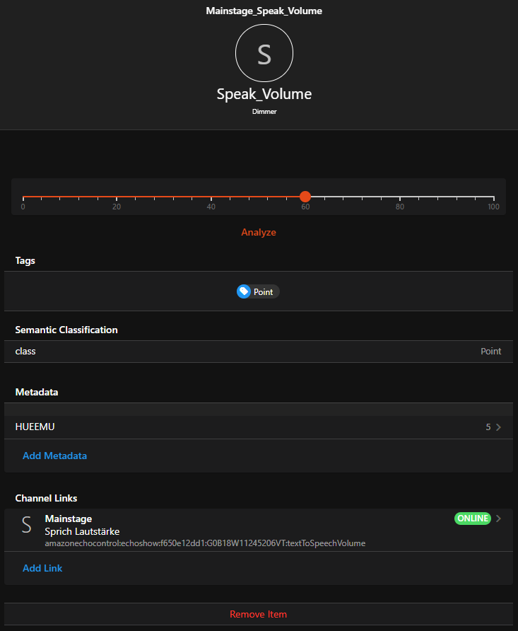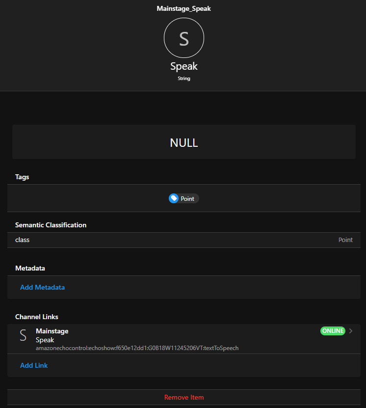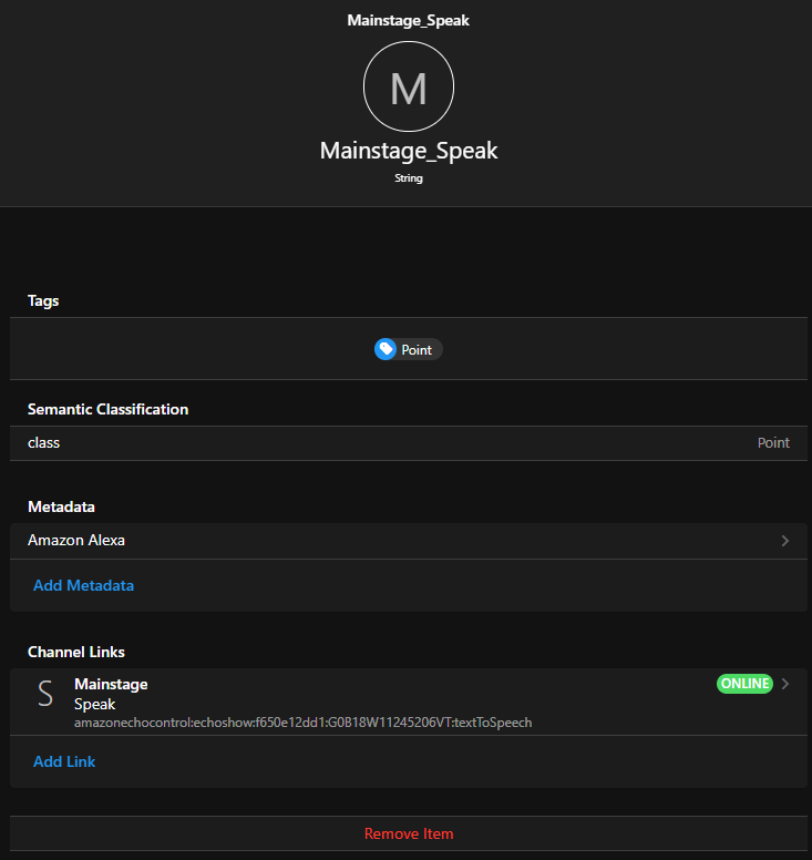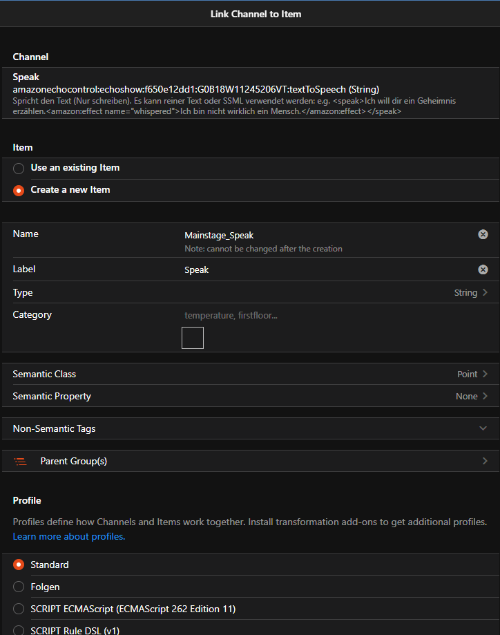 - I go to my Alexa Thing, select the TTS Channel, and create a link and a new item