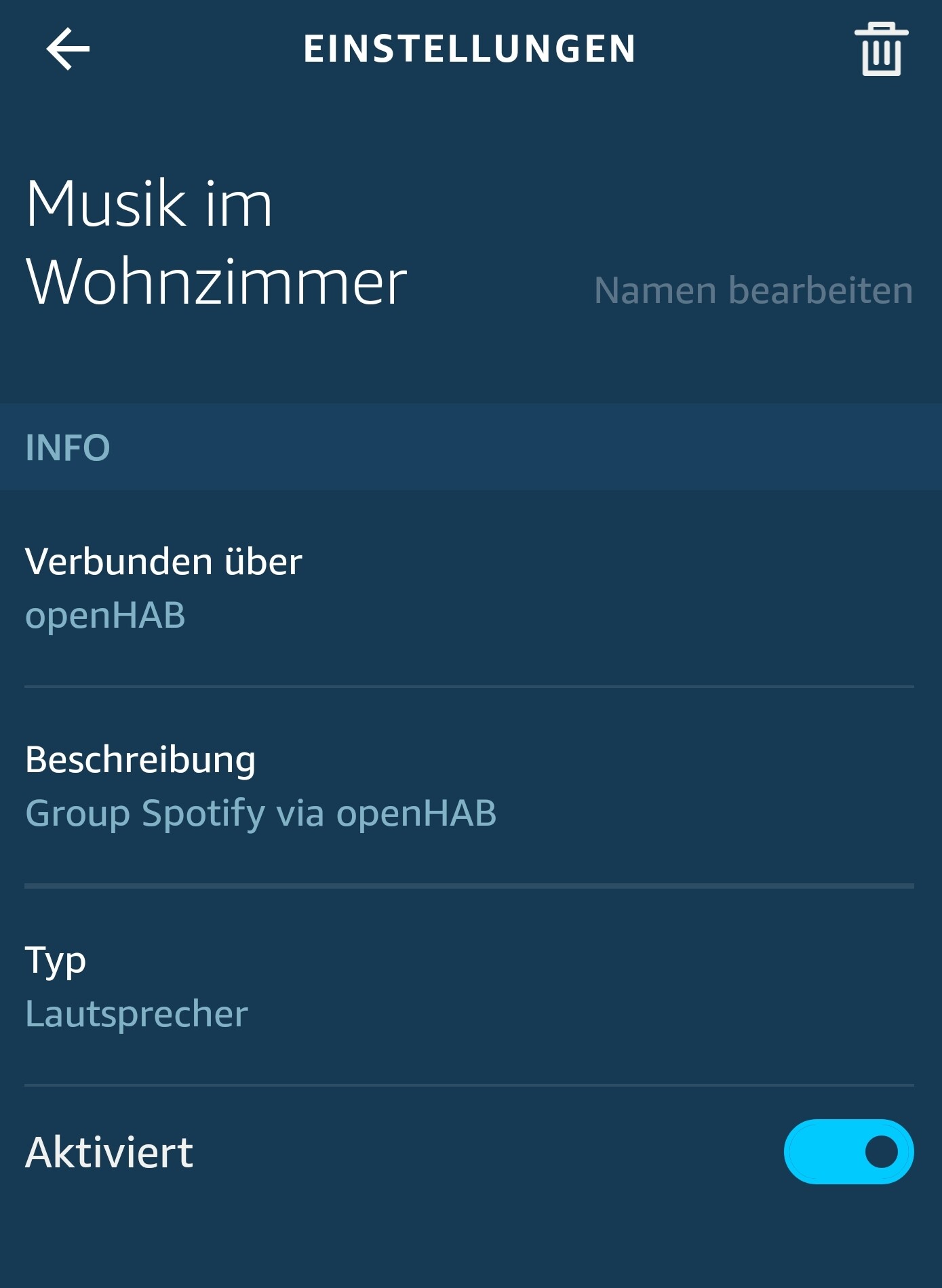As you can see I don’t use Alexa to control my lights in openhab. On the Alexa side I use the Hue skill to control the lights. In the screenshots that I attached to another post you can see that the speaker is registered as Lautsprecher (speaker) in the Alexa app.