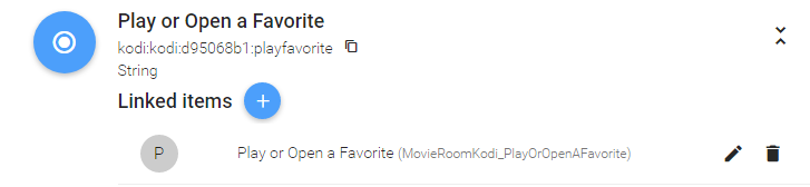 I had noticed that you can use String to select from a predefined list of options, but that means it’s hard coded list in the Item itself. However, the favourite list is dynamic and changing as the user adds and removed things in the Kodi gui. As this changed in Kodi, the combo box in the Paper UI item changes to reflect the contents… So the alexa prompt would need to match things in the Item, not the hard code list of string literal. In PaperUI, you open the combo box and pick one of the list of strings… Obv I am aming to say soemthing like “play favorite “apollo 13” on kodi”, or something like that. But “apollo 13” won’t be hard coded in the item.