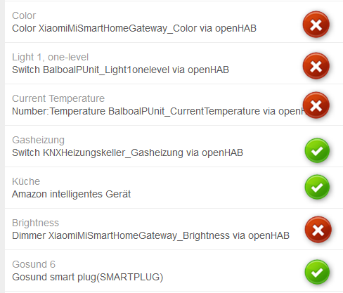 From the green ones, I only added the “Gasheizung” switch via Metadata, the “Küche” is an echo and “Gosund 6” is a smart plug, which I control via Alexa, so that makes sense, those two are found.