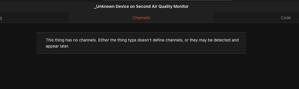 thanks for your reply, unfortunately that does not work. I deleted the Thing for the Air Quality Monitor, I deleted the binding, cleared the cache, all that is not working. The device is correctly found but when I add the thing after auto discovery, I don’t have channels.