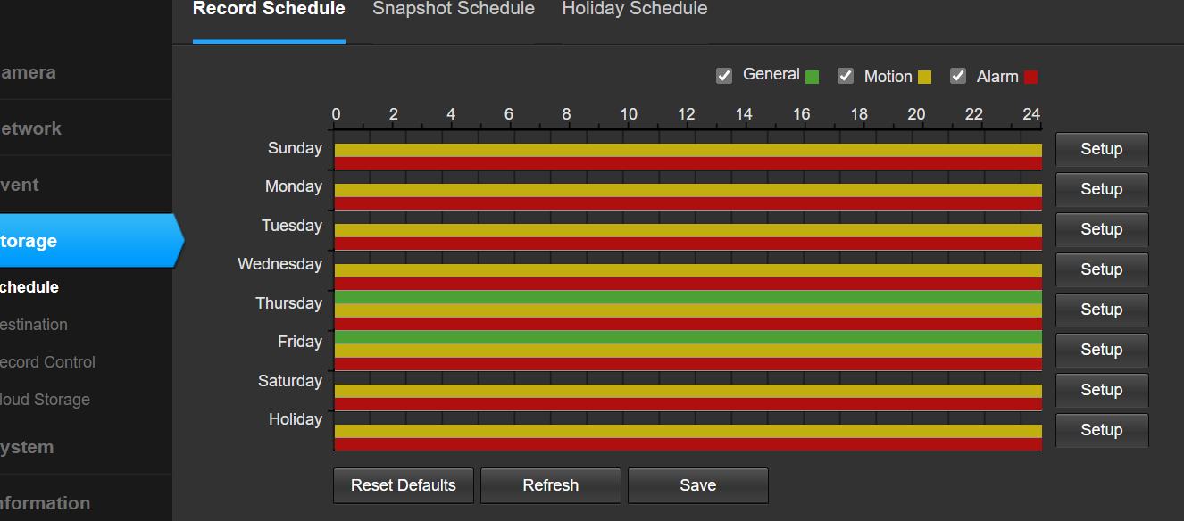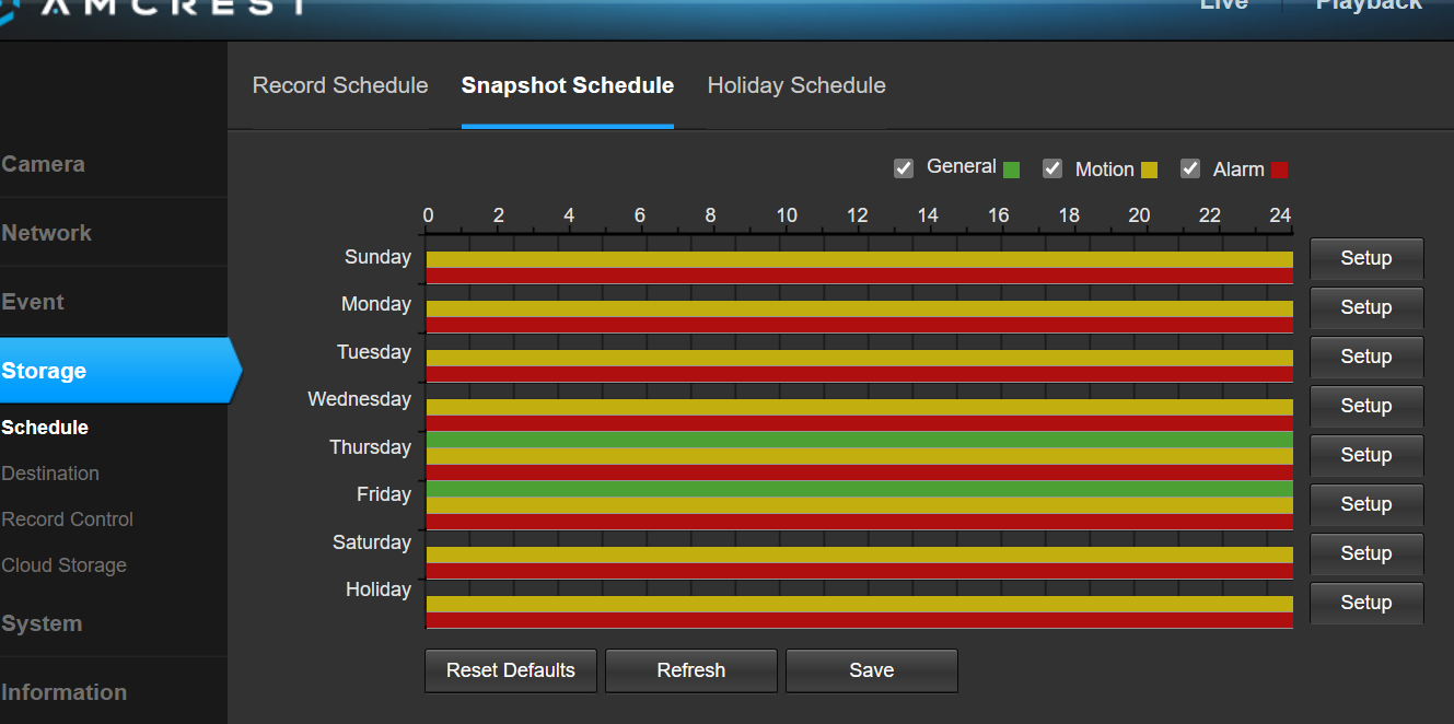 Setup the schedule to always be able to take snapshots, Note there is no green here so only when an alarm goes off the snapshots are set to be taken at 1 second intervals.