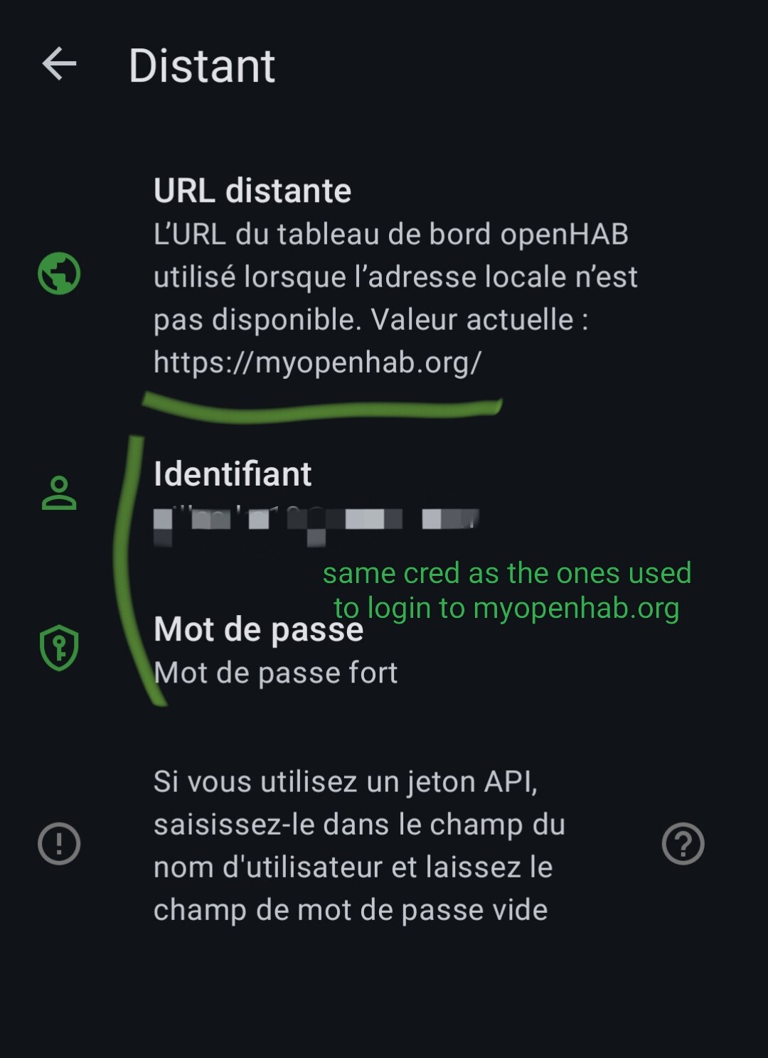 For the remote connection through the openHAB Cloud Server, you use https://myopenhab.org/ as the URL and the credentials you use to log in to myopenhab.org as the username and password.