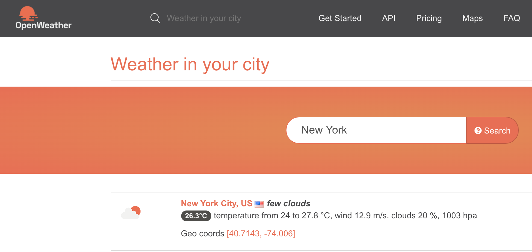 You have to use the geo coordinates given by Openweather Website (e.g. New York): Find - OpenWeatherMap