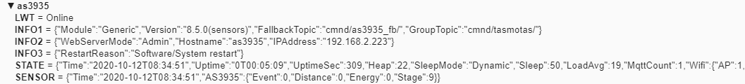I implemented the project with the AS3935 lightning sensor and now wanted to know what the names of the things and items that come from Tasmota during a thunderstorm are called. Without a thunderstorm I don’t see this data in the MQTT.