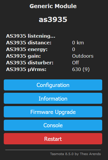Type number : as_distance [ stateTopic="tele/as3935/SENSOR", transformationPattern="JSONPATH:$.AS3935.Distance" ]