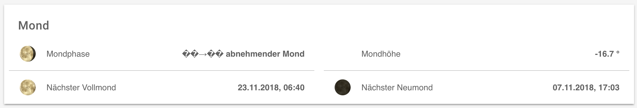 I have one problem though that I can’t get my head around. I understand that the icons might not show up in all user interfaces. When I’m using Basic UI on an iOS-device and a Mac/Safari-browser, all unicode icons are shown as diamonds with question marks. What I don’t understand though is that Swedish characters are presented as they should when they are part of labels defined in *.items or *.sitemap, but not when defined in the .map-file. For example, “Månfas” (Moon phase) is correct while “Fullmåne” (Full moon) will replace the “å” with two diamond/question marks. Any thoughts?