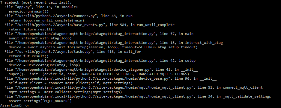 The assertion error is from the homie library. It looks like the settings['MQTT_BROKER'] variable is empty. If you set the MQTT_HOST environment variable, it will be used to set the settings['MQTT_BROKER'] for the library. This works well for Docker images.