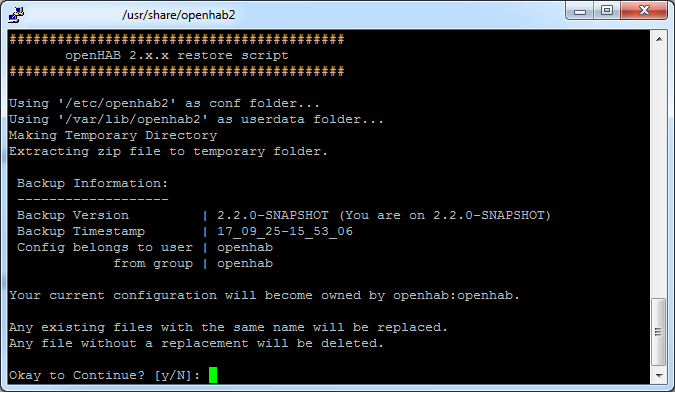 The restore script restores a zip file created using process above and uses it to completely replace your openHAB configuration. Any newer changes that weren’t in the backup get removed.