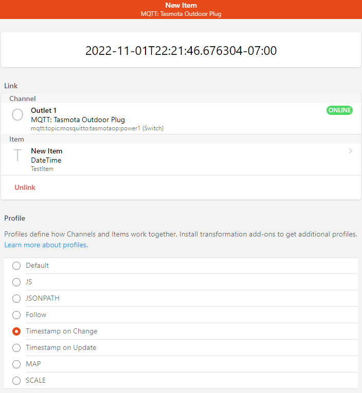 I unlinked the item from the channel and found I could not re-link it, as the item picker only allows items of type “contact”, and there’s no way to specify the profile before picking the item (I also tried the same on a dimmer channel with similar results). I created a new item from the link GUI, selected the appropriate profile and set. my item type to DateTime, and it worked. I subsequently deleted the original item and recreated it so I could reuse the name, and it appears to be working. Thanks for helping me along this journey; now I can go back to debugging the CSS on my widget.