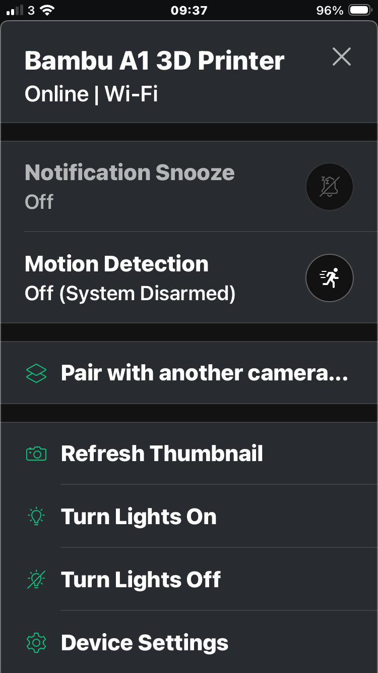 Weird menu (I Know) as the ‘Turn Lights On’ and ‘Turn Lights Off’ menus are both displayed all the time, no matter what the status of the light is (and for some reason the menu shows the plural ‘lights’, but this might be something to do with the ‘Pair’ option - but I only have one of these cameras).