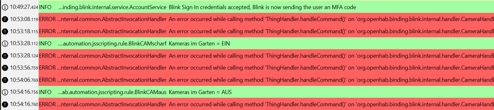 An error occurred while calling method âThingHandler.handleCommand()â on âorg.openhab.binding.blink.internal.handler.CameraHandler@18869dfeâ: Cannot call motion detection api without account or camera