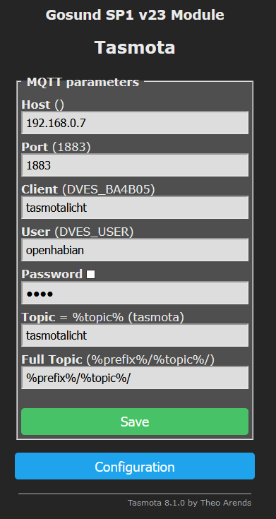 Now to my problem, i can’t get the switch turn on/off (or anything else) over openhab. I followed every tutorial i could find for sonoff or gosund/blitzwolf sockets but after 5 days im absolutely clueless…