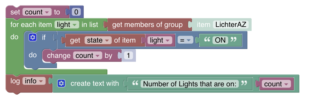 In your original code you want a count of the members that are on. I’m not sure how to do a filter on a List in Blockly but once you do that you’ll get back a smaller list. Then you plug that smaller list into the “length of” block.