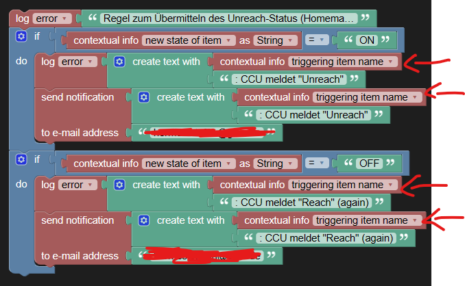 There have been several new blocks in Blockly for contextual info (e.g. the name of the triggering item, which is and works fantastic!). I use this block to let me know which of my HomematicIP-devices have gone offline (they each have a switch called “unreach” which the Gateway sets to “ON” if the device can’t be reached anymore).