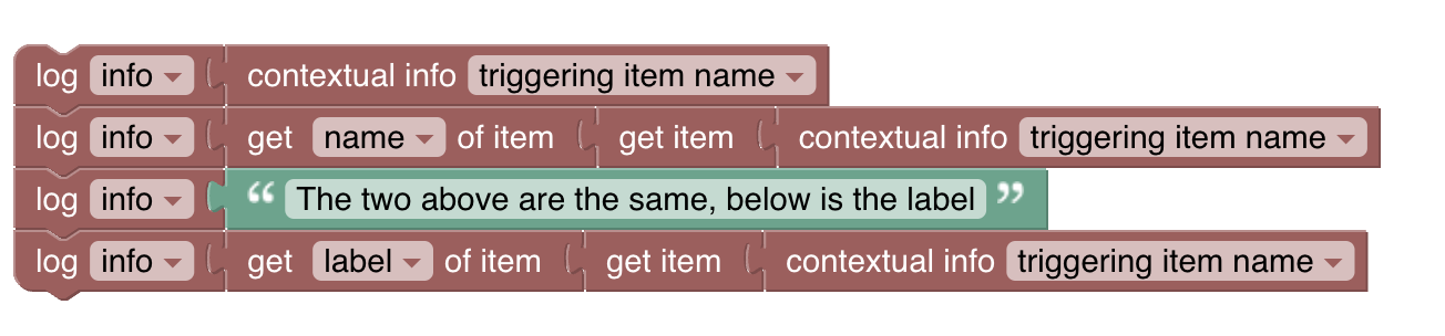 ) only access the name of the item, not the name of the triggering item. It’s not that big of a deal, but the label of an item typially looks much nicer than the rather cryptic name of an item.