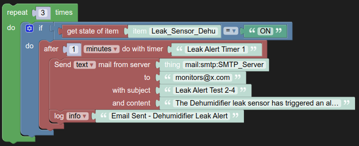 Things.getActions('mail', 'mail:smtp:SMTP_Server').sendMail('monitors@x.com', 'Leak Alert Test 2-4', 'The Dehumidifier leak sensor has triggered an alert. Please contact BPS at monitors@bpsgreenhomes.com or 910-470-8203');