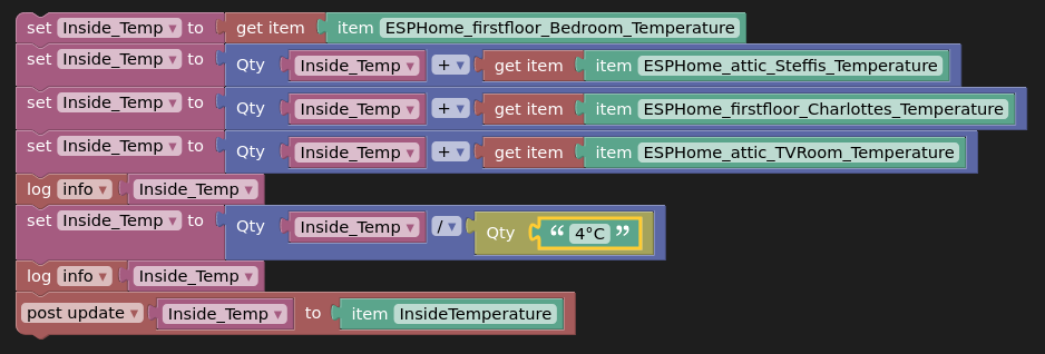 I want to calculate a new average inside temperature from four sensors. I have created a rule to update the new item InsideTemperature when one of the sensor values changes. The rule triggers an inline blockly ECMAScript (262 edition 11, OH4 4.2.0 stable).