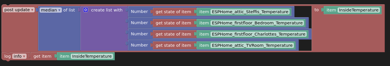 However, it is still a bit cumbersome to convert the item state into a pure number first, then do the median calculation and finally appending the unit again during the post update to InsideTemperature item. I thought the math calculation blocks are now able to handle the value plus the unit directly without stripping off the unit. Rules Blockly - openHAB Extensions to the Standard | openHAB