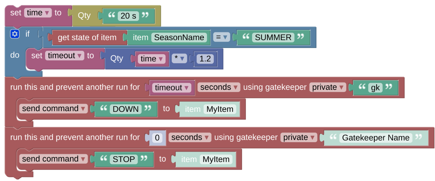 Unfortunately, all my Z-Wave things for rollershutter don’t support sending a position in percent. So I have to do something like send DOWN, wait a few seconds, send STOP. This works okay so far… Now I’m currently improving my rule with a more “dynamic” behaviour: I’m calculating some correction_factor and multiplying the default waiting in seconds with this factor; e.g. default is 20 s and so I get 20 s in winter and 24 s in summer. Now my workaround is to use an “not pretty” if - else if - else if - else to be able to use different wait times.
