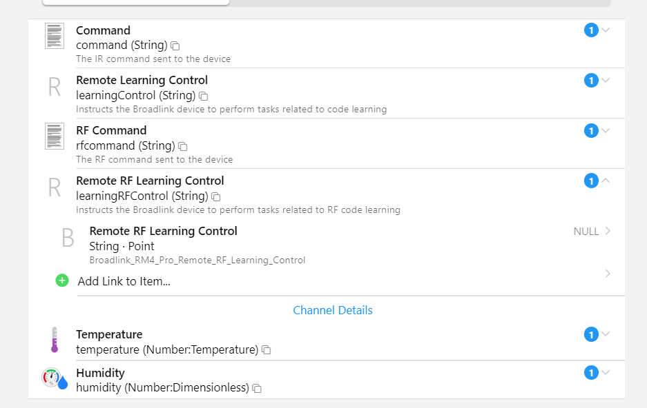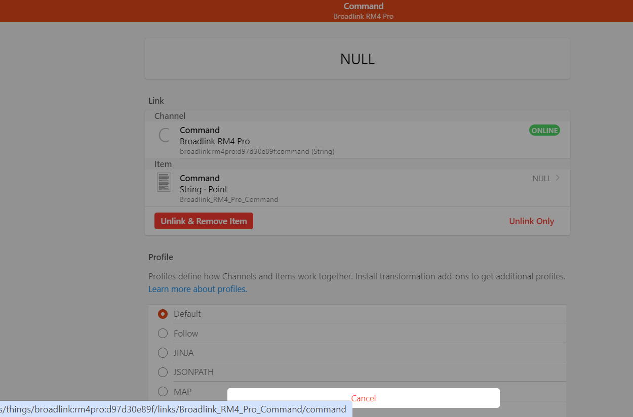 Yes, I created an Item for each channel of the RM4_pro thing, see below. I am running Openhab 4.1.3 in docker. Last image shows the single âcancelâ menu I get when I click the null for the command item. I canât see either rf.json or ir_json in jsondb folder.