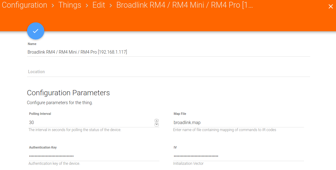 Clicking on the blue pencil/edit icon on the page above returns me back to the configuration for the thing, and the key and IV are still filled in…