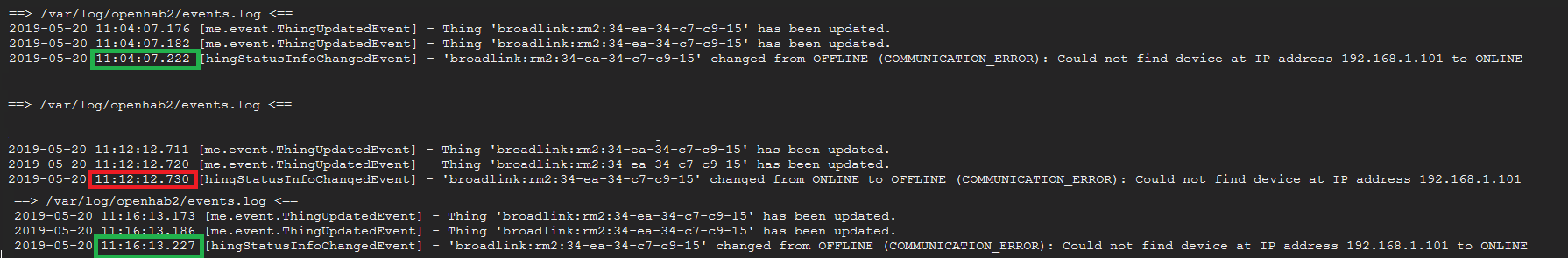 2019-05-01 14:04:29.080 [hingStatusInfoChangedEvent] - 'broadlink:a1:34-ea-34-b2-ba-7c' changed from ONLINE to OFFLINE (COMMUNICATION_ERROR): Could not find device at IP address 192.168.1.120