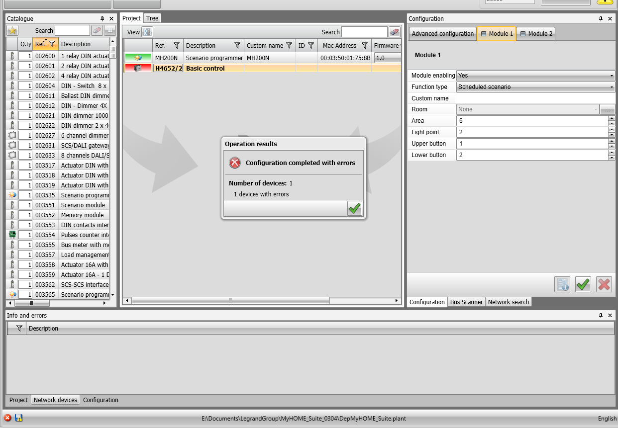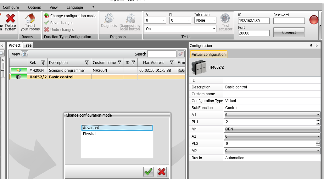 I have been able to successfully interrogate the MH202 with the MyHome Suite software and existing plant file and am well versed in how it runs now. It has it’s share of “interesting” ways in operating like for example you need to be “connected” to the MH202 when you wish to enter it and change scenarios. Then as long as you have saved changes, or indeed saved the plant file, you then have to be “disconnected” to then right click and Send Configuration to the MH202. You would think that whilst “connected” any “Save” function you engage would be logically sent to the MH202, but to save, disconnect and then send config seems a bit silly to me. Yes, can see why and how right now that I worked through and learned how it works, but it isn’t exactly logical for a new user. Also learned the same trick with sending the config to the individual devices after any changes.