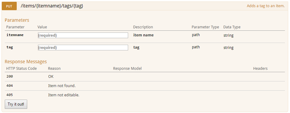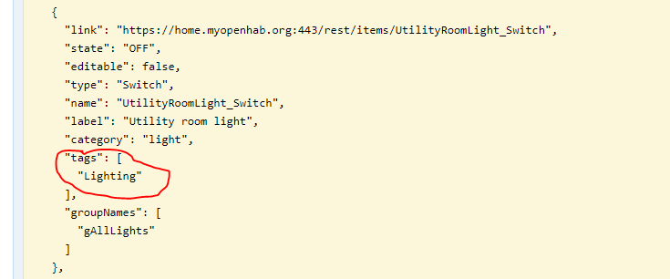eg below is part of the API response to ‘get items’ and you can see the tag. Editable =false because this item was created using the items file but PaperUI created items will be editable.