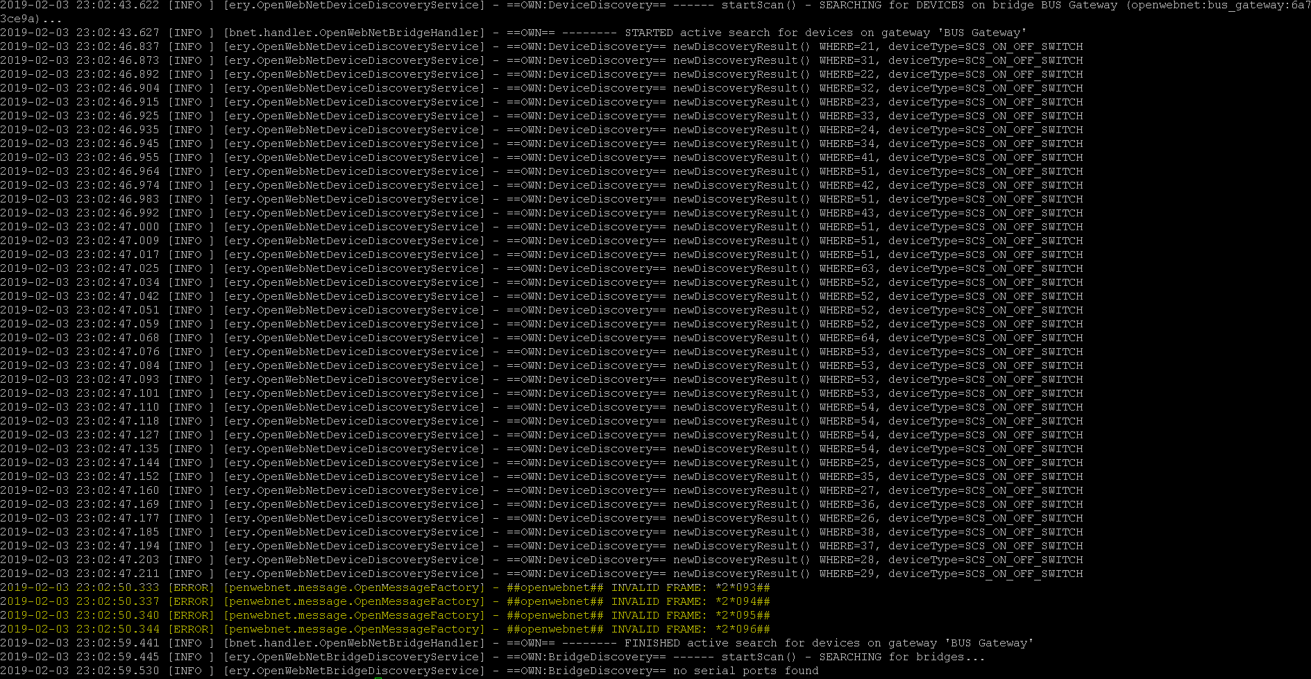 2019-02-03 23:02:43.622 [INFO ] [ery.OpenWebNetDeviceDiscoveryService] - ==OWN:DeviceDiscovery== ------ startScan() - SEARCHING for DEVICES on bridge BUS Gateway (openwebnet:bus_gateway:6a73ce9a)...