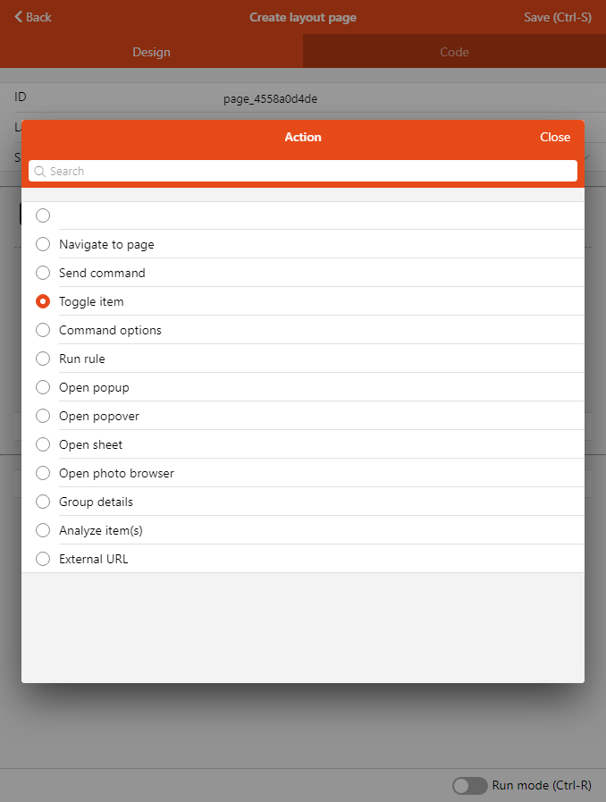 These action options allow you to configure the interactivity within your pages, as well as the relation between them, in an extensive way. You can navigate to another page, display additional controls, popups and other modals, send commands to items every time a widget allows you to choose an action. For instance, a floor plan marker might either open another page in a popup, or toggle an item.