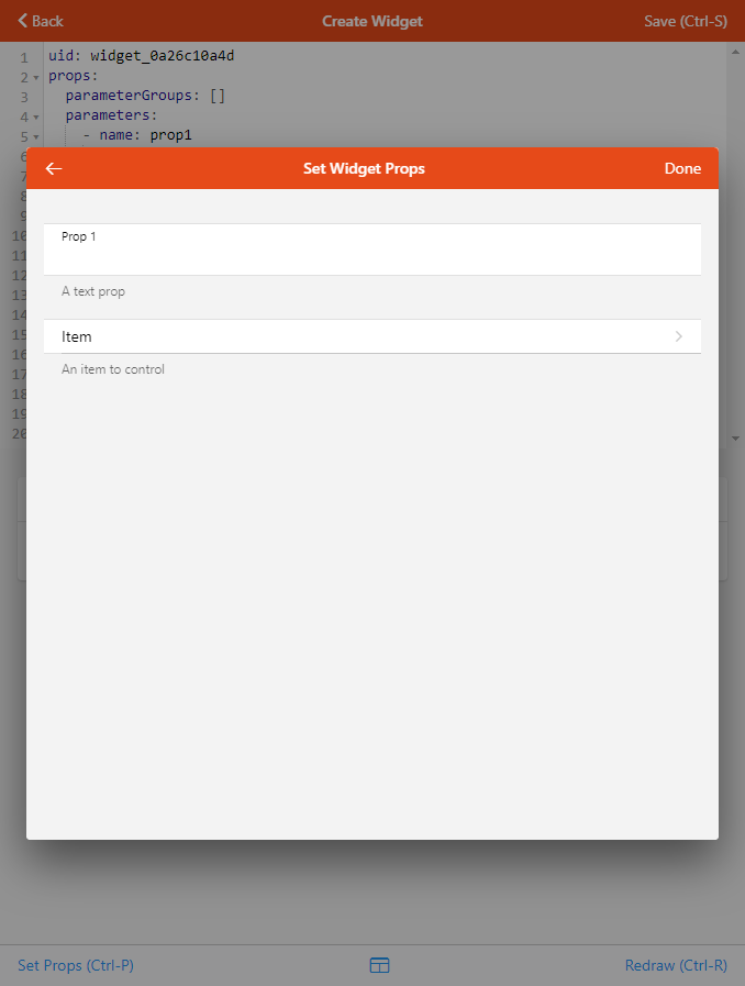To actually see how the config sheet would look like, and specify props for your widget for the live preview, click on Set props (Ctrl-P) and configure them as needed: