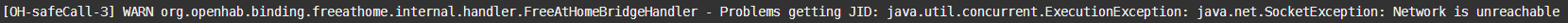 [OH-safeCall-3] WARN org.openhab.binding.freeathome.internal.handler.FreeAtHomeBridgeHandler - Problems getting JID: java.util.concurrent.ExecutionException: java.net.SocketException: Network is unreachable