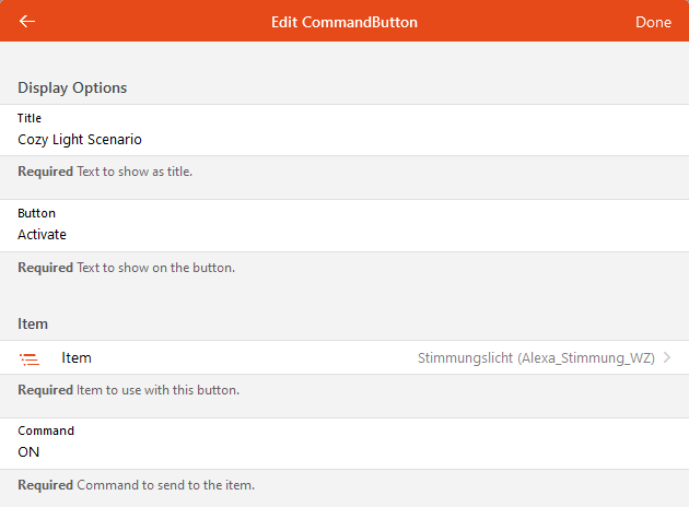- description: Command to send to the item.