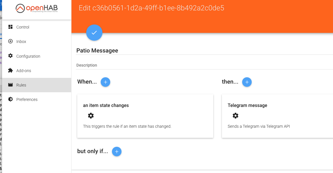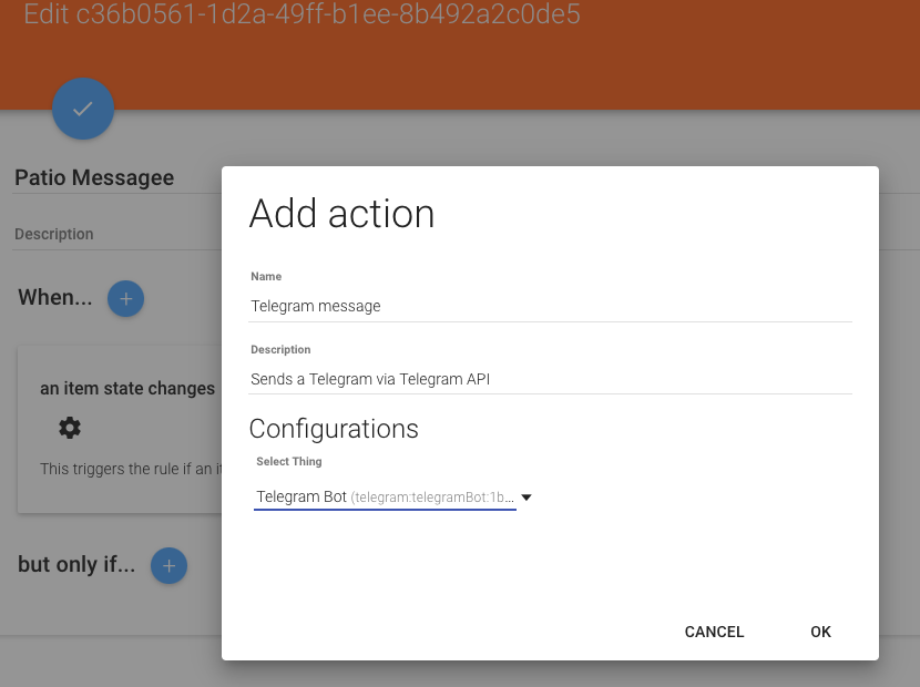 Trying to use the Telegram binding to send messages on actions. I configured the bot according to the docs. When I send the bot a chat via Telegram app, I do see the update in PaperUI, so I know it’s working in receive mode at least.