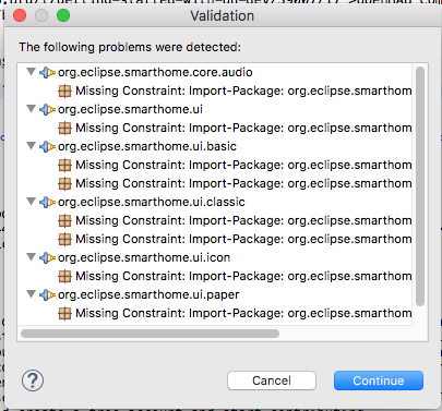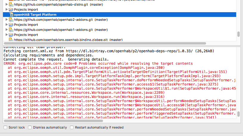 Hi, I had the problem that Eclipse marked any annotation as an error (seems to be an Eclipse bug). So I cleaned the openhab-master folder and want to re-install the environment. I tried it now several times, basic install goes through, but when Eclipse wants to exec the startup tasks the process aborts. I already tried to include more or less of the installation options with the same problem.
