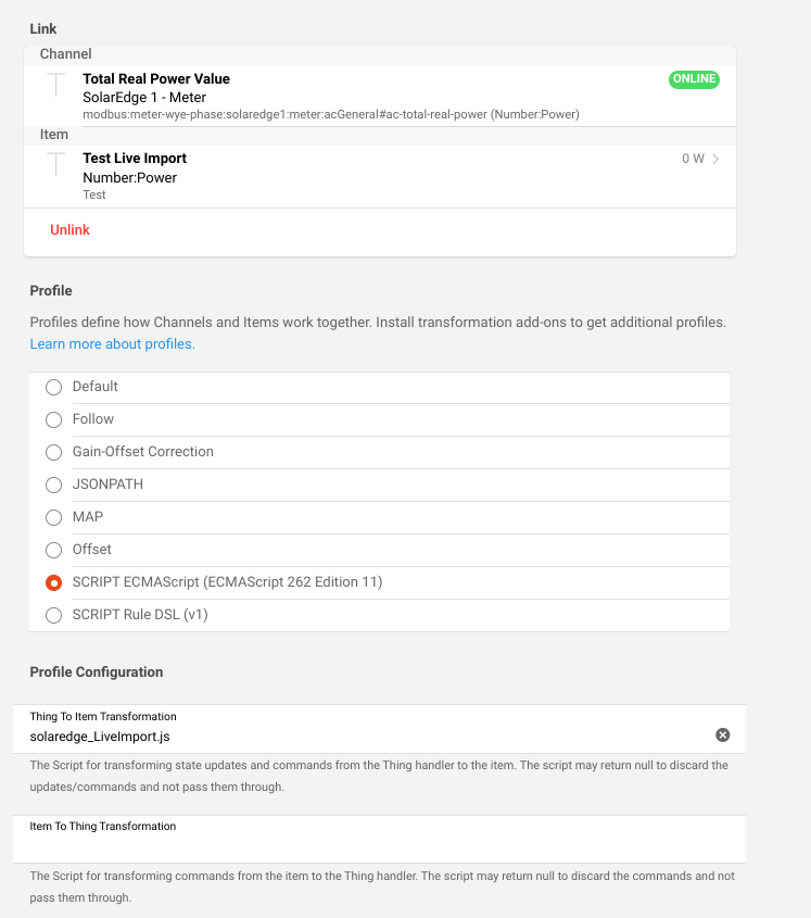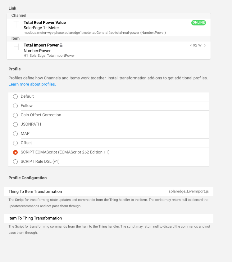 Neither 'toItemScript' nor 'toHandlerScript' defined in link 'H1_SolarEdge_TotalImportPower -> modbus:meter-wye-phase:solaredge1:meter:acGeneral#ac-total-real-power'. Profile will discard all states and commands.