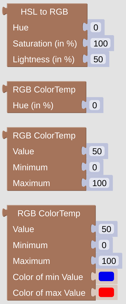 The three RGB ColorTemp helpers are made to convert a user supplied value into some color from a color-spectrum of two values. Usually this spectrum is ranging from red (HSL[0, 100%, 50%]) to blue (HSL[250,100%, 50%]), from warm to cold.