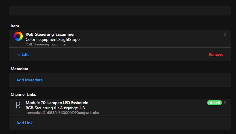 I was working around to continue configuring my items in openHAB, when I came across a problem while configuring my lightstrips. They are connected through an Output to my central smarthome system, so the configuration should be easy. My main problem is a bug (?) in my semantic layout when i´m trying to connect my Lightstrips. The HSB sliders are simply not shown. I just wanted to know if someone recently got the same problem when trying to link RGB strips, and if yes, if someone knows any workarounds. The whole bug looks very weird and I did not experienced any problem when configuring it the first time (I switched from my main server to a rasp pi)