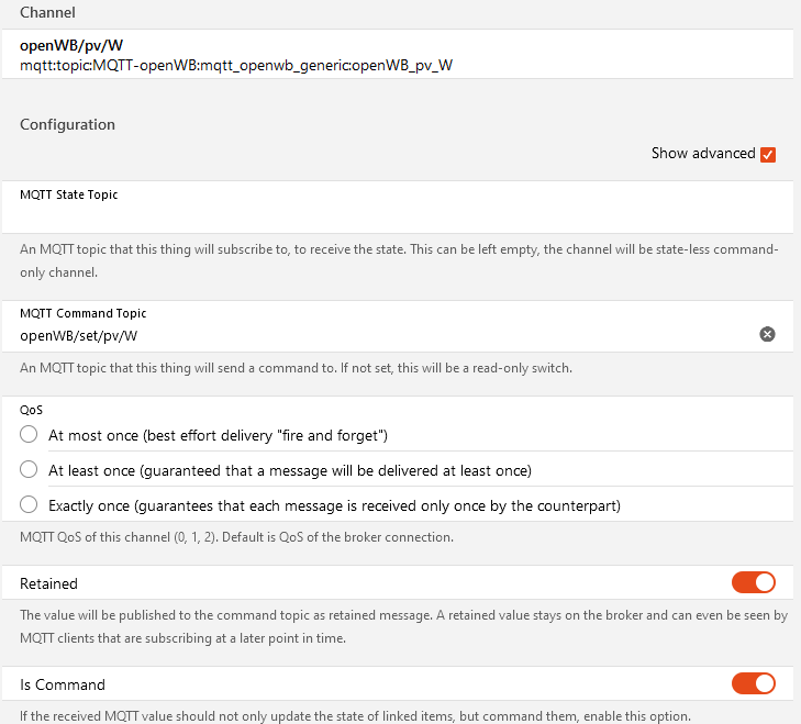 I figured out, that I am able to write to openWB/set/pv/W using MQTT Explorer. But if I try to send my PV current production to the openWB from openHAB it wont work.