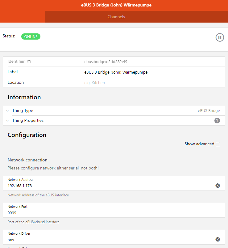Then i connect to the ebusd adapter 3 over WiFi, the adapters IP and port and the “raw” network driver (not “ebusd” as i stated initially) of the ebus binding in openhab. This definetely works out.