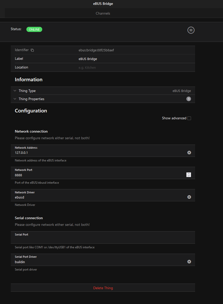 If i apply the ebusd network driver, i need to start the daemon within the Windows docker desktop first. Then, within the openhab ebus bridge, i connect to the computers IP (here 192.168.1.100) and port (here 8888) where the docker desktop with ebusd is running. IP and port are now not those of the ebusd adapter 3. This setup takes now full advantage of ebusd. Its a bit complicated because i am a Windows10 user. Using a Pi, this should be much simpler because docker is not needed and openhab can run on the same Unix computer than ebusd.